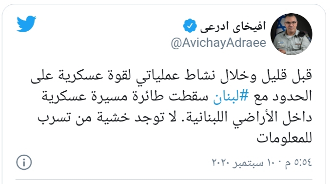 في المقابل، كتب المتحدث باسم الجيش الإسرائيلي أفيخاي أدرعي: “قبل قليل وخلال نشاط عملياتي لقوة عسكرية على الحدود مع لبنان سقطت طائرة مسيرة عسكرية داخل الأراضي اللبنانية. لا توجد خشية من تسرب للمعلومات”.