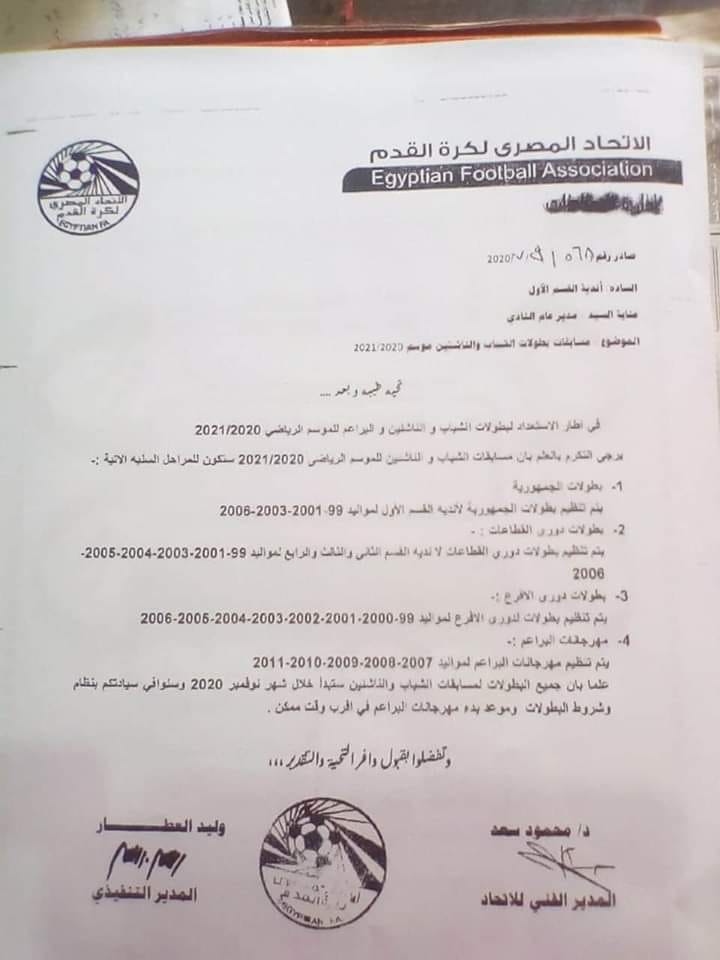 وأخطر اتحاد الكرة، الفروع والأندية بخطاب رسمي معتمد من الكابتن وليد العطار المدير التنفيذي لاتحاد الكرة، والدكتور محمود سعد المدير الفني للاتحاد، إقامة بطولات دوري الجمهورية للناشئين والشباب لأندية القسم الأول لمواليد 99 و2001 و2003 و2006.