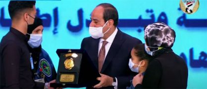 وتبادل الرئيس عبد الفتاح السيسى، التحية العسكرية مع نجل الشهيد عميد مصطفى عبيدو، خلال تكريم اسم والده.
