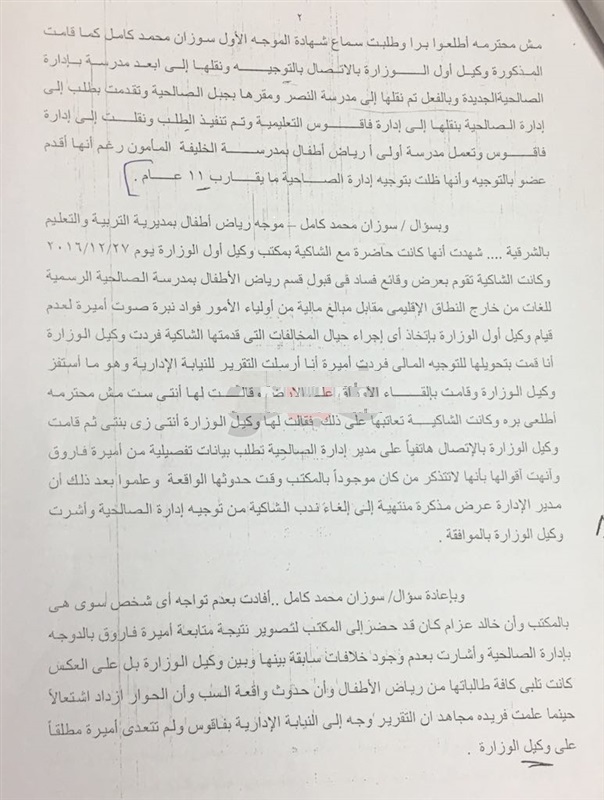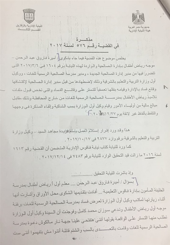 وبسؤال الشاكية أمام النيابة الإدارية، أكدت أنها أثناء زيارتها لمكتب المتهمة بصفتها وكيل أول الوزارة لعرض وقائع فساد بمدرسة الصالحية الرسمية للغات برفقة موجه أول رياض الأطفال وتدعى سوزان محمد كامل، وفوجئت بها تطلب منها التستر على الواقعة بقولها: “انتي هتفتحي علينا جبهة نار، مالكوش دعوة بمدرسة الصالحية الرسمية للغات” وقامت بالتعدي بالسب والشتم عليها قائلة: “إنتوا مش بتفهموا انتي ست مش محترمة اطلعوا بره”، وقامت بالاتصال بالتوجيه ونقلها إلى أبعد مدرسة بإدارة الصالحية الجديدة، وبالفعل تم نقلها إلى مدرسة النصر ومقرها بجبل الصالحية، رغم كونها أقدم عضو بالتوجيه منذ ما يقرب من 11 عامًا.
