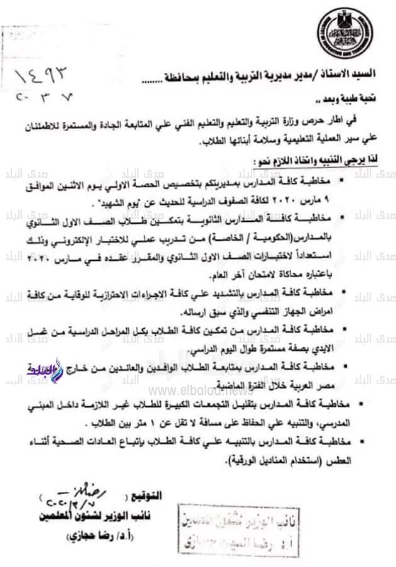 التعليم تنبه بالحفاظ علي مسافة لا تقل عن 1 متر بين الطلاب بجميع مدارس الجمهورية للوقاية من كورونا